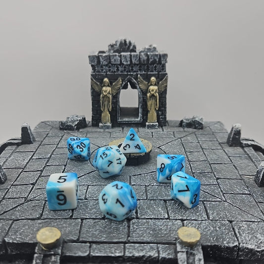 Blue and White 7 Piece Boxed Dice Set for Role play Gaming
