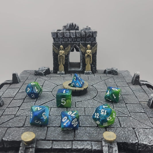 Green and Blue 7 Piece Boxed Dice Set for Role play Gaming