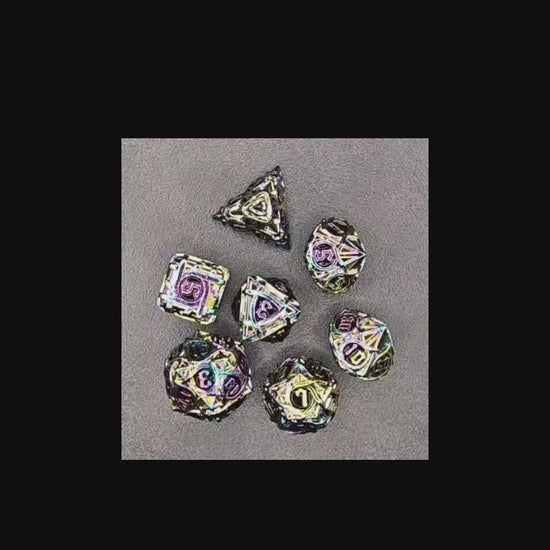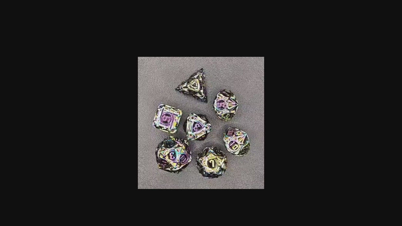 Each poly 7 piece set contains one D20, D12, D10, D8, D6, D4 and percentile dice and an a metal tin.