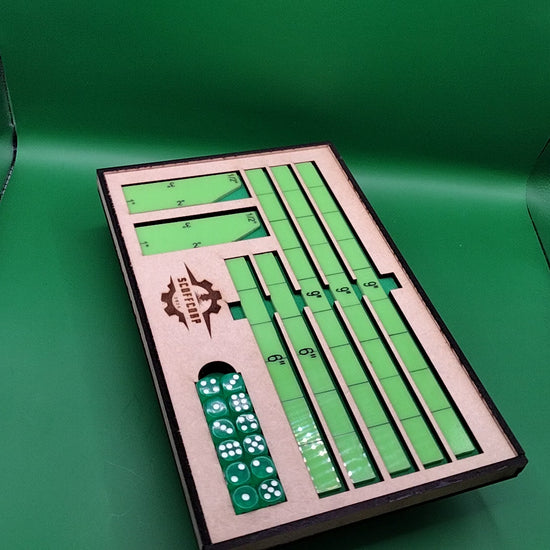 Green Scoffcorp Dice Tray and Gauges (Measuring Stick) set