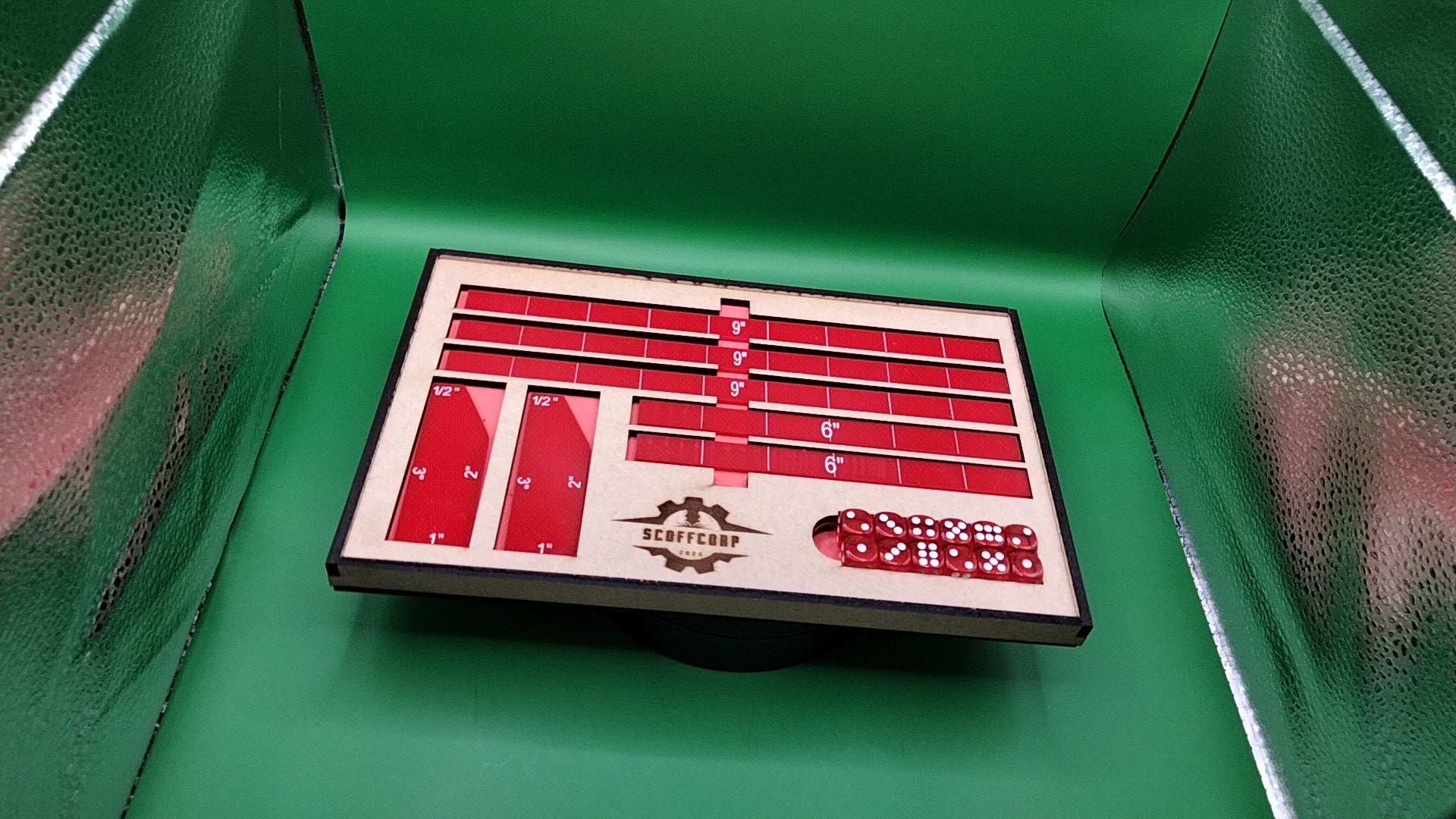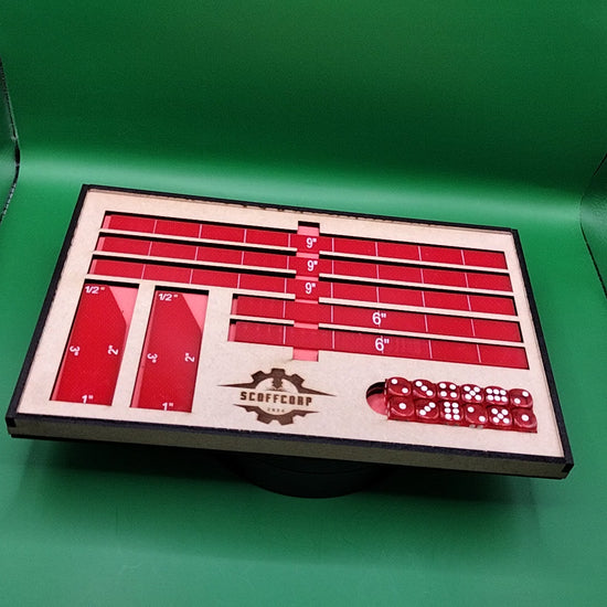 Red Scoffcorp Dice Tray and Gauges (Measuring Stick) set